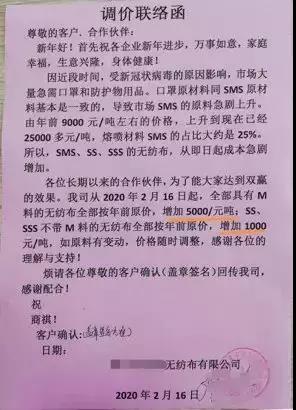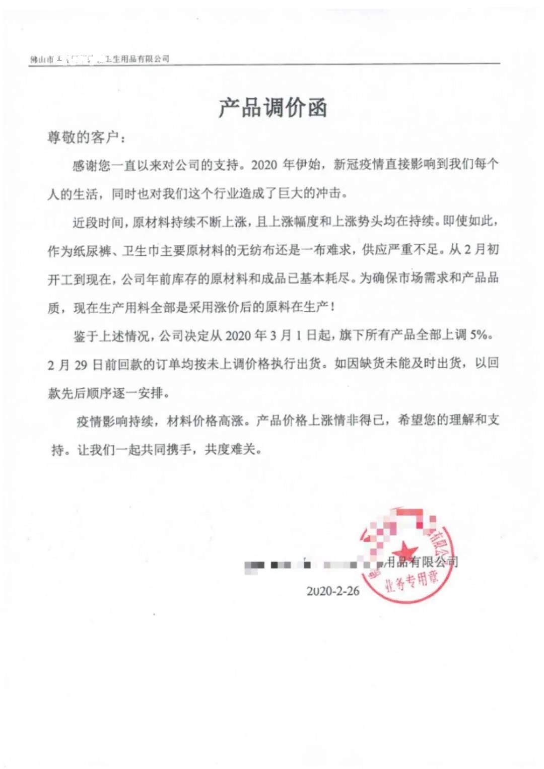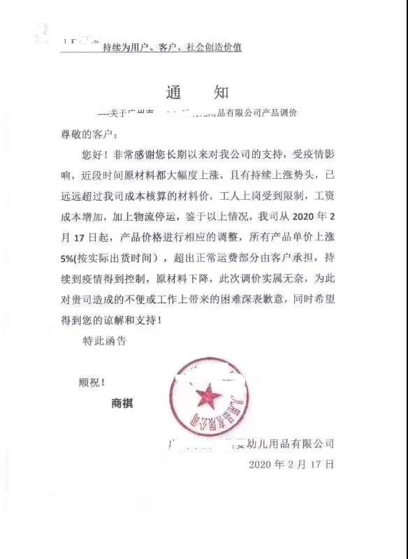 “3月1日起,旗下所有產(chǎn)品上調(diào)5%”,“產(chǎn)品價(jià)格進(jìn)行相應(yīng)調(diào)整,原有的價(jià)格體系取消”。所有產(chǎn)品單價(jià)上漲5%,超出正常運(yùn)費(fèi)部分由客戶承擔(dān),持續(xù)到疫情得到控制,原材料下降”