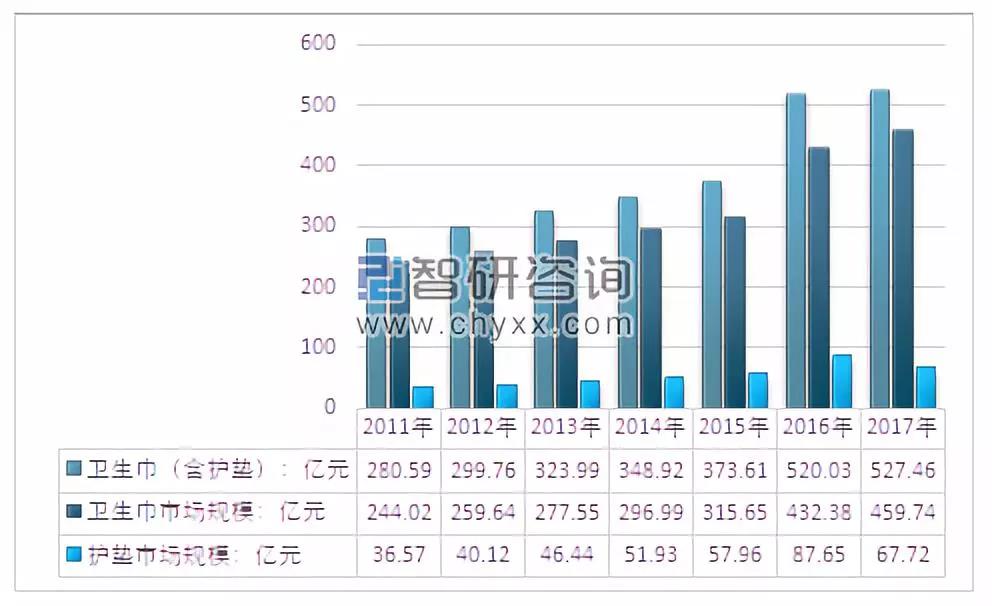 根據中國造紙協(xié)會生活用紙專業(yè)委員會的數據,2011 年至2017年,衛(wèi)生巾(含護墊)消費量從839.6億片增加到1200.1 億片,市場規(guī)模從280.59億元擴大至527.46億元。