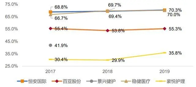 從整體的費(fèi)率來(lái)看,穩(wěn)健醫(yī)療最高為37.5%,百亞股份次之為32.0%,豪悅護(hù)理最低為11.1%。拆分來(lái)看,擁有自主品牌的穩(wěn)健醫(yī)療和百亞股份 2019年銷售費(fèi)用率分別為 30%和 27%,恒安國(guó)際次之為 14%,做代工業(yè)務(wù)的豪悅護(hù)理僅為5%。管理費(fèi)用率方面,恒安國(guó)際最高,2019年為 5.7%,豪悅護(hù)理最低為1.8%。研發(fā)費(fèi)用率方面,豪悅護(hù)理和穩(wěn)健醫(yī)療最高,2019年均為 3.4%。