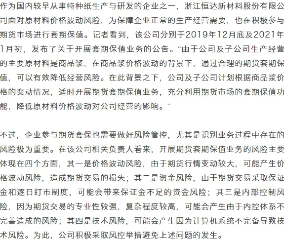 “為了規(guī)避突發(fā)事件對紙漿需求的影響,國貿(mào)紙業(yè)在去年1月份通過賣出套保鎖定了在手貨物的預期利潤。同樣的,在4月份國外疫情開始暴發(fā)的時候,出于對后市海外需求銳減的考慮,國貿(mào)紙業(yè)也及時通過套期保值對沖了在途貨物的價格風險。”