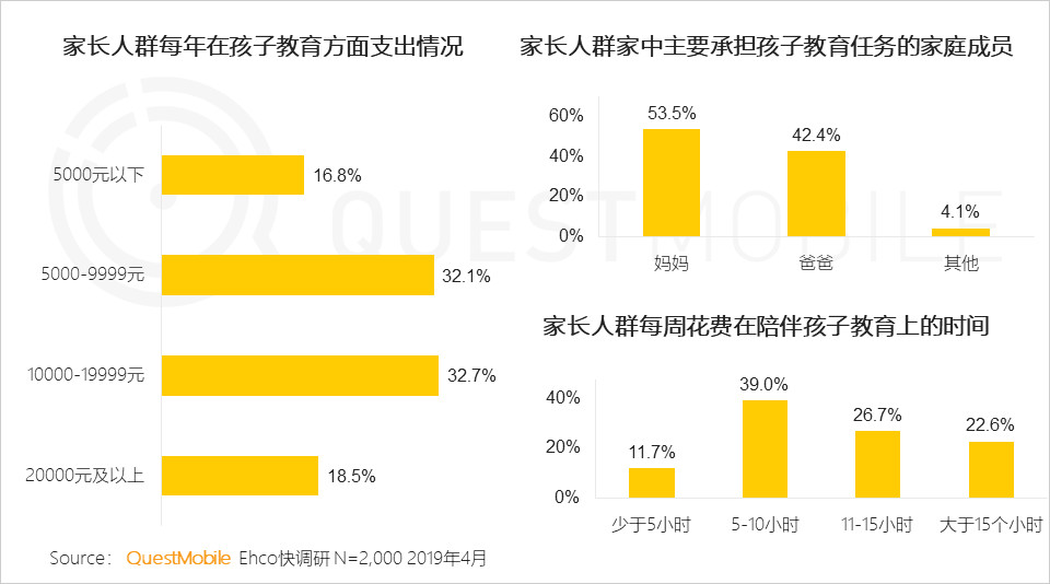 而在家庭人群每年在孩子教育方面支出情況,超八成的家長(zhǎng)每年在孩子的教育方面支出均在5000元以上,其中10000-19999元占32.7%,5000-9999元占32.1%??梢?jiàn)人們對(duì)于孩子的教育成長(zhǎng)真是寄予厚望。而在家長(zhǎng)人群中媽媽作為主要承擔(dān)孩子教育任務(wù)占53.5%。從中可以看到在孩子的教育問(wèn)題上,“媽媽”才是教育決策的主要決策者。而在家長(zhǎng)人群每周花費(fèi)在陪伴孩子教育上的時(shí)間5-10小時(shí)占比最高,達(dá)到39%。