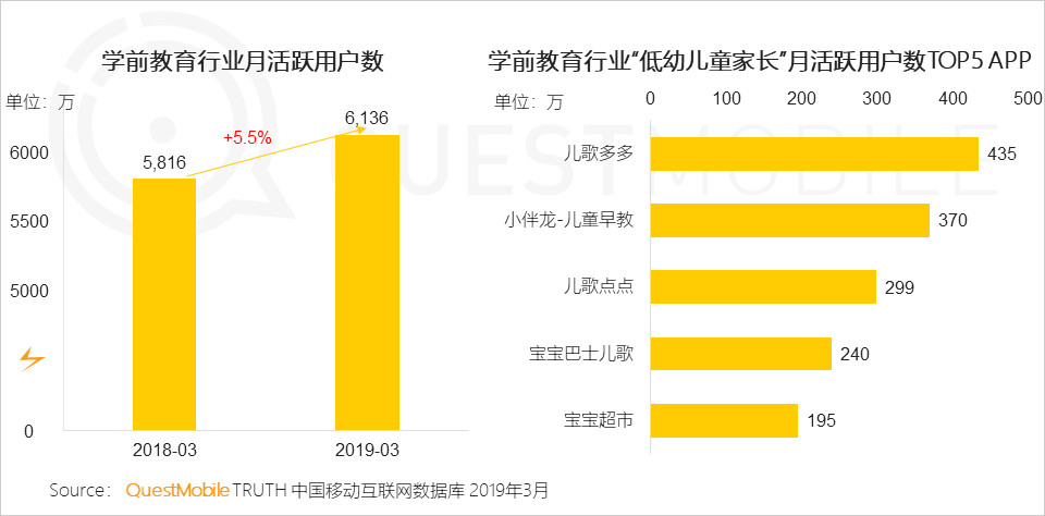 最新數(shù)據(jù)顯示,學(xué)前教育用戶增速明顯高于整體移動(dòng)網(wǎng)民增長(zhǎng)速度,而在線早教憑借技術(shù)的快速發(fā)展深得家長(zhǎng)喜愛(ài),在學(xué)前教育行業(yè)”低幼兒童家長(zhǎng)“月活躍用戶數(shù)TOP5APP排列依次分別是兒歌多多、小伴龍-兒童早教、兒歌點(diǎn)點(diǎn)、寶寶巴士?jī)焊?、寶寶超市。其中早教APP兒歌多多以435萬(wàn)排列第一,其次為小伴龍-兒童早教月活躍用戶達(dá)370萬(wàn)。