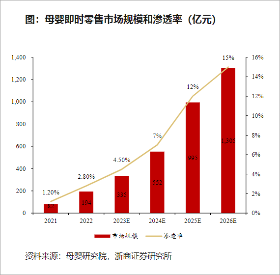 年輕母嬰用戶對于“即時性”“便捷化”的追求,推動母嬰即時零售渠道的狀態(tài),截止2022年該渠道規(guī)模約194億元,預(yù)計2026年將達1305億元,年復(fù)合增長74%,勢頭尤為猛烈。