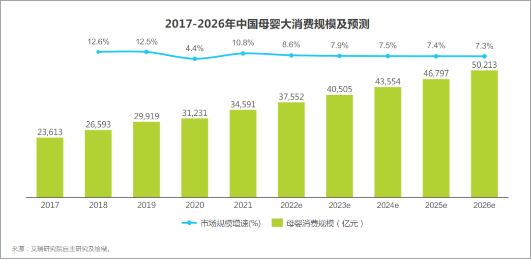 據(jù)艾瑞咨詢數(shù)據(jù)顯示,自2017年中國母嬰消費規(guī)模持續(xù)增速基本保持在10%以上,其中再受疫情影響的2020年下滑至4.4%之后已經(jīng)逐漸回暖。