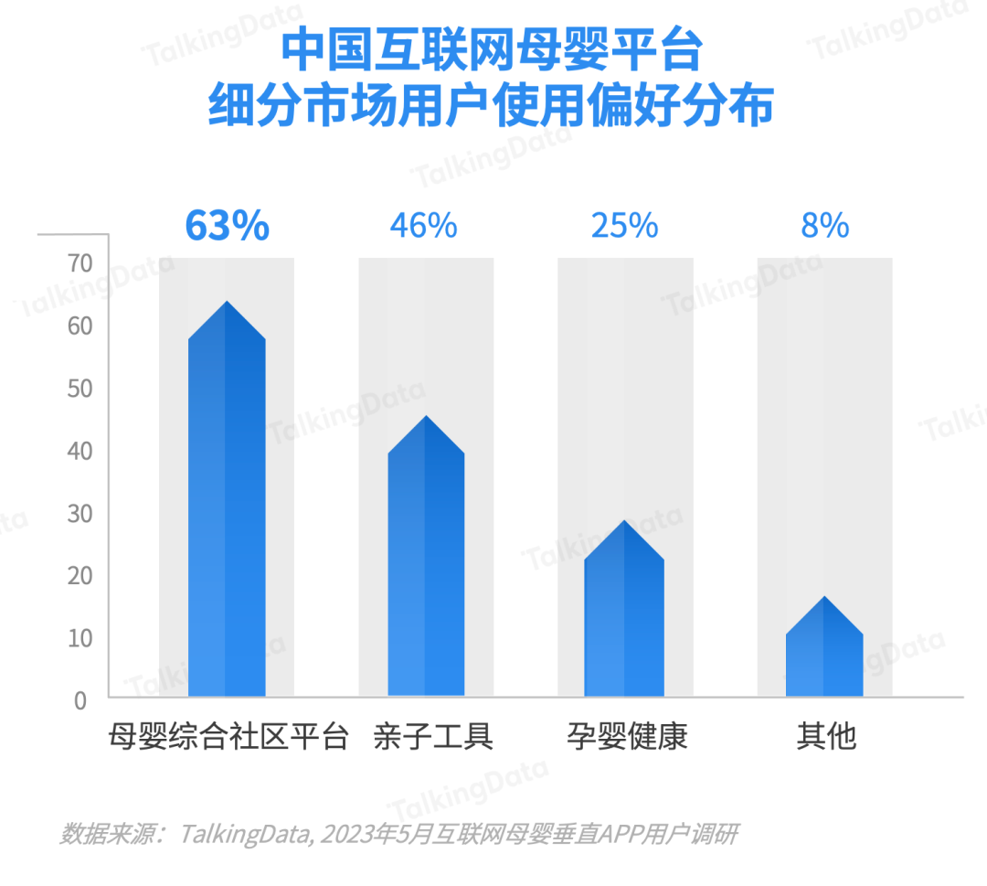 使用母嬰綜合社區(qū)的母嬰平臺(tái)用戶占比更高,達(dá)到63%,這表明用戶更偏愛涵蓋工具+社區(qū)等復(fù)合型垂直平臺(tái)。