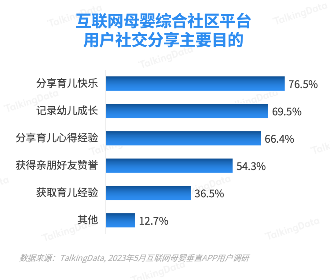 對(duì)于分享目的,超過7成用戶愿意分享育兒過程中的快樂和幸福,傳遞正能量;同時(shí),69.5%用戶是為了記錄孩子成長的過程,66.4%的用戶是為了分享育兒心得經(jīng)驗(yàn)。