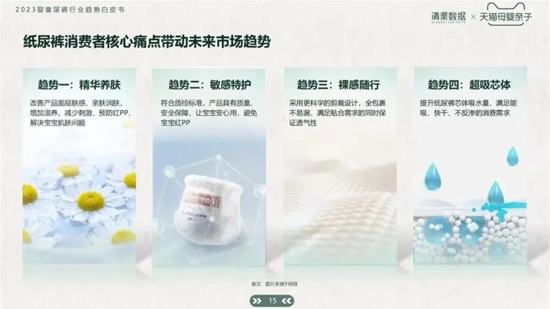 為解決6月齡內(nèi)新生兒的紅屁屁問題;1歲齡左右寶寶的側(cè)漏后漏問題;以及隨著寶寶年齡增長,對紙尿褲吸水量需求變大、紙尿褲表層潮濕等問題,有超過50%的消費者表示,愿意為產(chǎn)品的特殊功能和成分升級支付更多費用。延伸出了精華養(yǎng)膚、敏感特護(hù)、裸感隨行、超吸芯體四大趨勢。