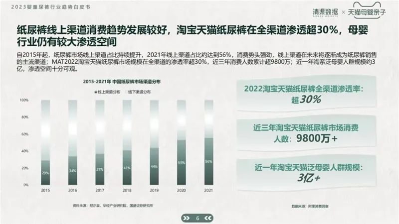 截止2021年,一半以上的紙尿褲都是由線上渠道賣出,消費勢頭強(qiáng)勢。近三年消費人數(shù)累計超9800萬,近一年淘系泛母嬰人群已有3億+規(guī)模。