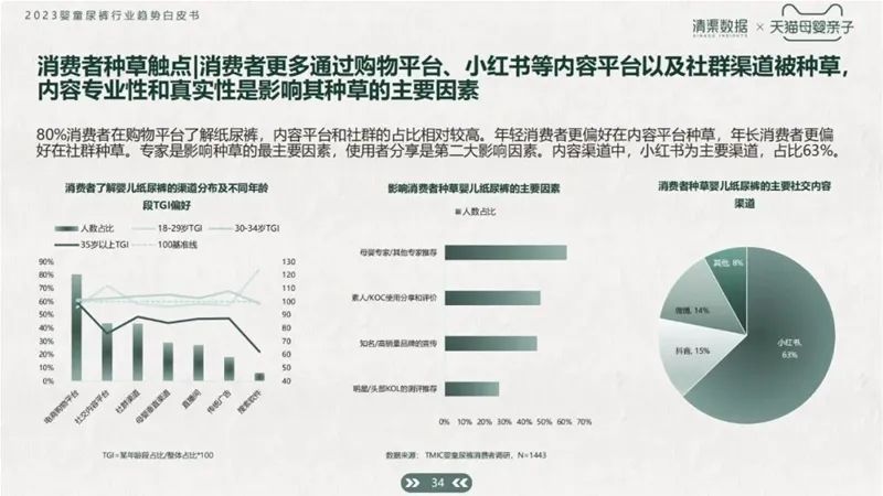 根據(jù)白皮書數(shù)據(jù)統(tǒng)計,80%消費者在購物平臺了解紙尿褲,內(nèi)容平臺和社群的占比相對較高。年輕消費者更偏好在內(nèi)容平臺種草,年長消費者更偏好在社群種草。專家是影響種草的最主要因素,使用者分享是第二大影響因素。內(nèi)容渠道中,小紅書為主要渠道,占比63%。