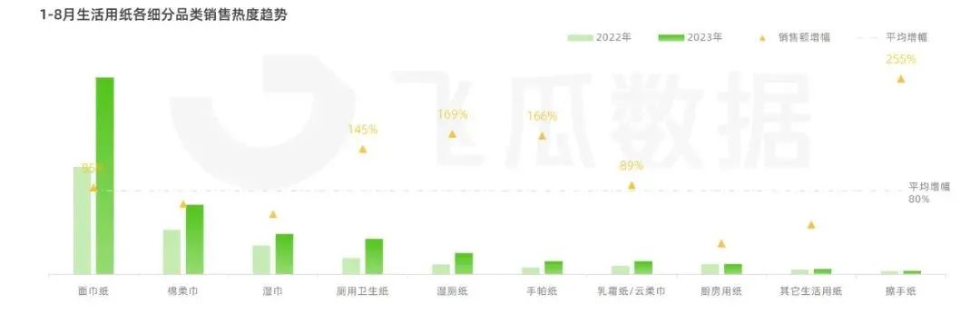 在各大電商平臺(tái)中,抖音電商表現(xiàn)出強(qiáng)勁增勢(shì),2023上半年生活用紙的品類銷售熱度較去年同期增長(zhǎng)75.4%。