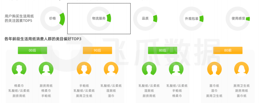在購買關(guān)注點(diǎn)方面,除了價(jià)格外,紙品的品質(zhì)、外觀包裝和使用感受也是影響消費(fèi)者購買的關(guān)鍵因素。相比80年代的用戶,新時(shí)代消費(fèi)者們更注重使用體驗(yàn)等因素,且在生活用紙使用方面更多會(huì)選擇新興產(chǎn)品。