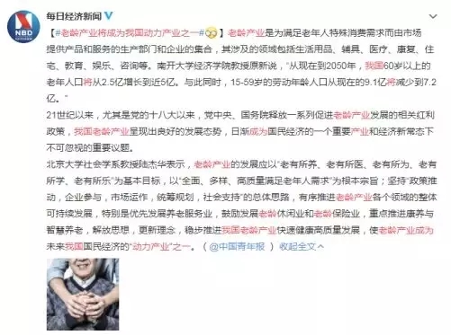 隨著中國老齡化進(jìn)程的加快,產(chǎn)業(yè)發(fā)展的機(jī)遇也逐漸到來。近日,#老齡產(chǎn)業(yè)將成為我國動力產(chǎn)業(yè)之一#引發(fā)網(wǎng)民熱議~