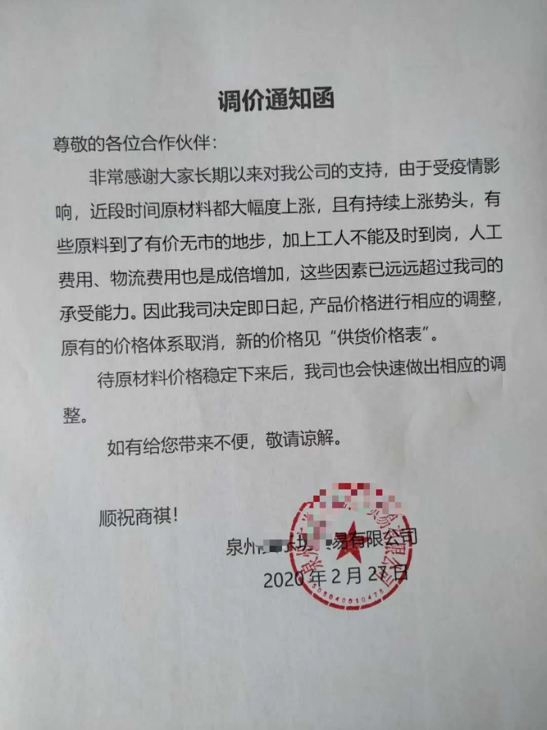 “3月1日起,旗下所有產(chǎn)品上調(diào)5%”,“產(chǎn)品價格進(jìn)行相應(yīng)調(diào)整,原有的價格體系取消”。所有產(chǎn)品單價上漲5%,超出正常運費部分由客戶承擔(dān),持續(xù)到疫情得到控制,原材料下降”