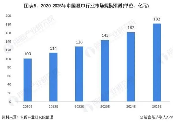 另一方面,2019年底全國疫情的爆發(fā)極大地刺激了濕巾的消費需求。2020年1-5月,阿里濕巾線上銷售額均在1億元左右,2020年4月銷售額更是高達1.32億元,2020年2月環(huán)比增速達到113.63%。此次“新冠疫情”較2003年非典更加嚴重,進一步激化了國人對衛(wèi)生健康的關(guān)注。同時,隨著我國經(jīng)濟積極向好,居民消費能力及意愿不斷提升,企業(yè)不斷探索制造多元化的濕巾,后疫情時代我國濕巾行業(yè)發(fā)展前景更為明朗,預(yù)計2025年市場規(guī)模有望達到182億元。