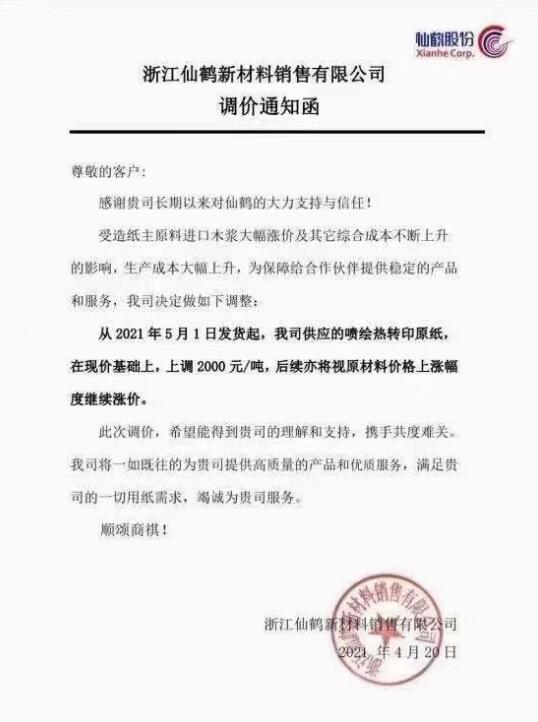 仙鶴新材料:5月1日發(fā)貨起,我司供應(yīng)的噴繪熱轉(zhuǎn)印原紙,在現(xiàn)價基礎(chǔ)上,上調(diào)2000元/噸,后續(xù)亦將視原材料價格上漲幅度繼續(xù)漲價。