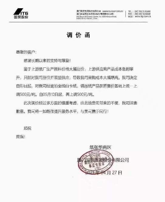 廈門國貿(mào)紙張華南區(qū):即日起,對我司經(jīng)營的全線白卡紙、銅版紙產(chǎn)品在原售價基礎(chǔ)上統(tǒng)一上調(diào)500元/噸。自5月10日起,再上調(diào)500元/噸。