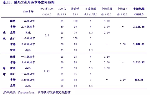考慮到滲透率、日均使用量以及產(chǎn)品價(jià)格帶多種因素的差異,我們同樣按照不同地區(qū)劃分對(duì)嬰兒衛(wèi)生用品市場(chǎng)規(guī)模進(jìn)行了預(yù)測(cè)。其中因?yàn)?-3歲區(qū)間內(nèi)不同年齡段嬰兒的日均更換頻次不同,預(yù)測(cè)中進(jìn)行了取均數(shù)處理,通常新生兒每日應(yīng)該更換6-8次,隨著年齡的增長(zhǎng)時(shí)間間隔可以逐步拉長(zhǎng)。綜上,我們樂觀預(yù)期我國(guó)嬰兒衛(wèi)生用品的終端市場(chǎng)規(guī)模約2100億元,保守也可達(dá)到1100億元,較20年市場(chǎng)規(guī)模有60%-200%的提升空間;出廠價(jià)按照樂觀1.50元/片、保守1.20元/片的行情預(yù)測(cè),出廠市場(chǎng)規(guī)模也可達(dá)到490-1000億元。