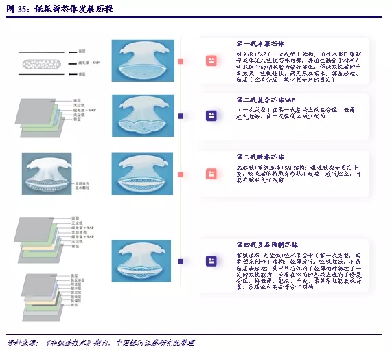 自香港的瑞德國(guó)際旗下品牌Fitti菲比(1992年),以及金佰利旗下品牌好奇(1994年)進(jìn)入中國(guó)大陸市場(chǎng),我國(guó)嬰兒衛(wèi)生用品行業(yè)經(jīng)歷了快速發(fā)展,產(chǎn)品在材質(zhì)、結(jié)構(gòu)等層面不斷迭代更新。行業(yè)整體與其核心——芯體的發(fā)展歷程相近,以2006年為階段性節(jié)點(diǎn),在此之前,我國(guó)的嬰兒衛(wèi)生用品行業(yè)以外資品牌為主,好奇、幫寶適、媽咪寶貝等國(guó)際品牌集中進(jìn)入中國(guó)市場(chǎng),產(chǎn)品芯體雖有結(jié)構(gòu)分區(qū)的變化,但以絨毛漿和SAP材質(zhì)為主導(dǎo);2006年不含絨毛漿的復(fù)合芯體結(jié)構(gòu)出現(xiàn),此后國(guó)內(nèi)品牌大舉擴(kuò)張,市場(chǎng)內(nèi)多品牌混戰(zhàn)。