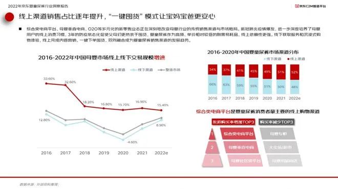 報(bào)告顯示,2022年中國嬰童尿褲市場(chǎng)渠道分布上,線上渠道占比已經(jīng)超過線下渠道達(dá)到52%,而以京東為代表的綜合類電商是嬰童尿褲消費(fèi)者最主要的線上購物渠道。