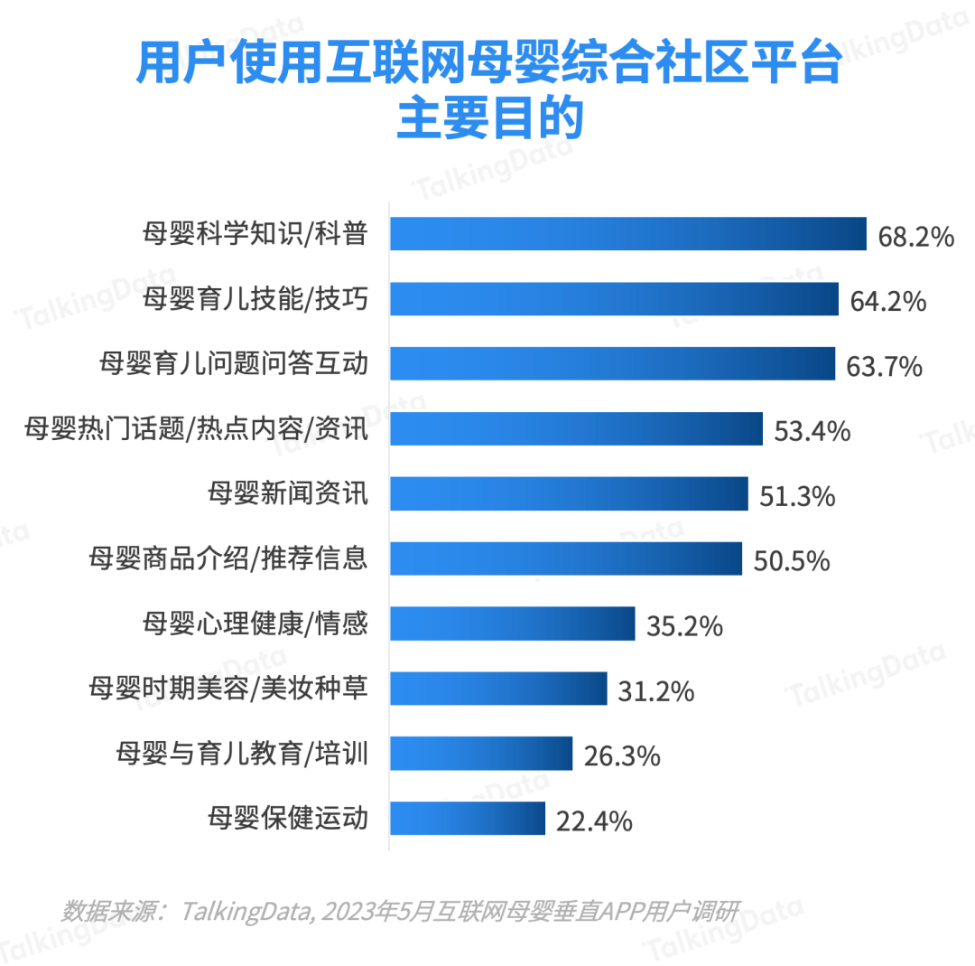 用戶使用母嬰綜合社區(qū)平臺主要是為了獲取母嬰科普信息、育兒技能和育兒話題互動。