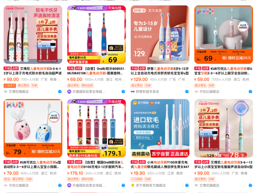 而除此之外,在性能方面差異性不大。從淘寶平臺(tái)中可見(jiàn),各大品牌的外觀和賣點(diǎn)都十分相似,如“軟毛”“超聲波”“小刷頭”“卡通外觀設(shè)計(jì)”“高效清潔”。